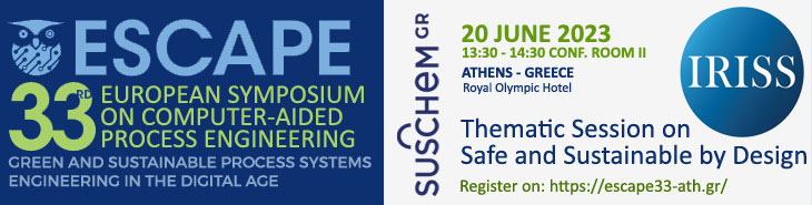 We are pleased to invite you to the Thematic Session on the IRISS–SSbD Project organized by the IPSEN NTUA team and SusChem GR which will be held at the Royal Olympic Hotel in Athens on Tuesday, June 20th 2023 at 13.30pm – 14.30pm (EEST), within the frame of the ESCAPE-33 Conference which is devoted to “Green and sustainable process systems engineering in the digital age”.